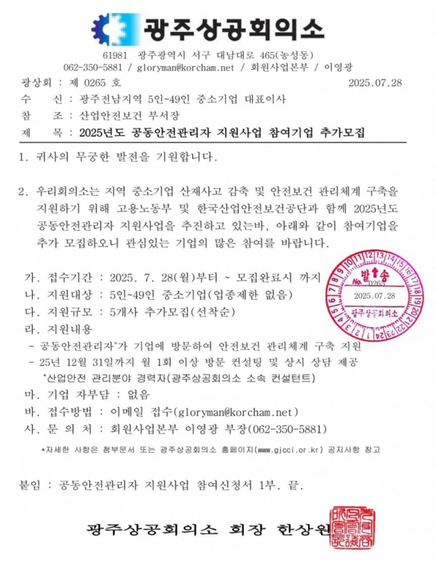 (광주상공회의소) 2025년도 공동안전관리자 지원사업 참여기업 추가모집